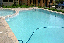 Surrounded by a shady sunbathing area with sunbeds and umbrellas, is the swimming pool and Jacuzzi.
