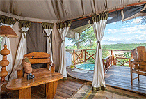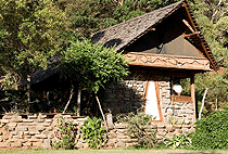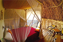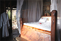 Each cottage is has its own patio, wild-olive beds, private flush toilet and an open air en-suite bathroom with a bath tab.